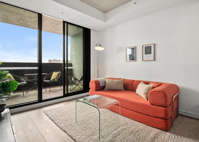 Appartement Modern, Industrial Hideaway à Ville de Ville de Melbourne de 52 m^2 se trouve à proximité de plusieurs attractions touristiques et est à moins de 5 minutes à pied de Brunswick Street. Situé à moins de 2 km du Parlement, l'appartement comprend une piscine sur le toit ainsi qu'un bain chaud.